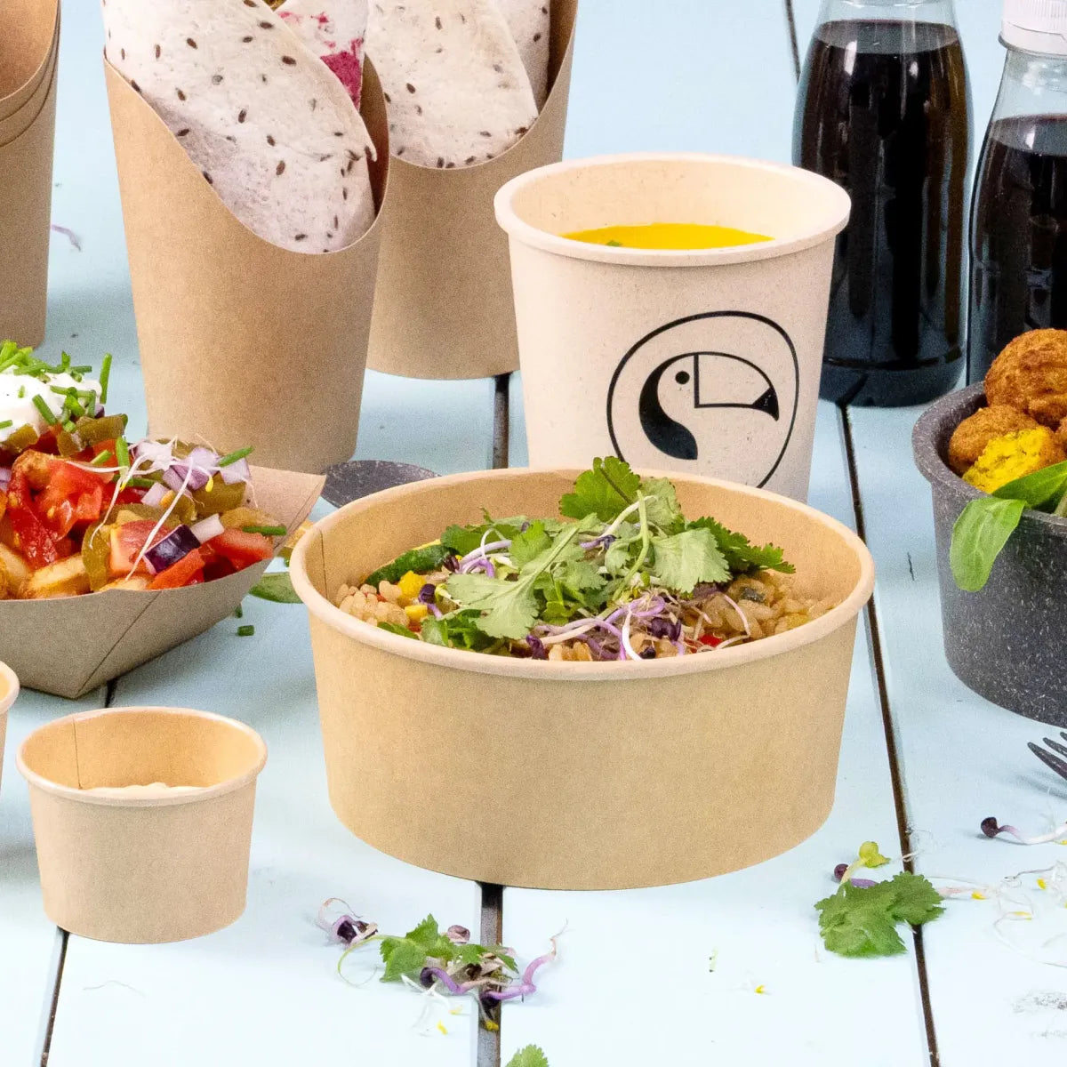 Queste vaschette di cartone sono un passepartout per la frenetica routine quotidiana della ristorazione. L'aspetto naturale del cartone kraft attira una clientela attenta all'ambiente, mentre il rivestimento in PE le rende allo stesso tempo sufficientemente funzionali per zuppe calde, curry grassi e insalate fresche.